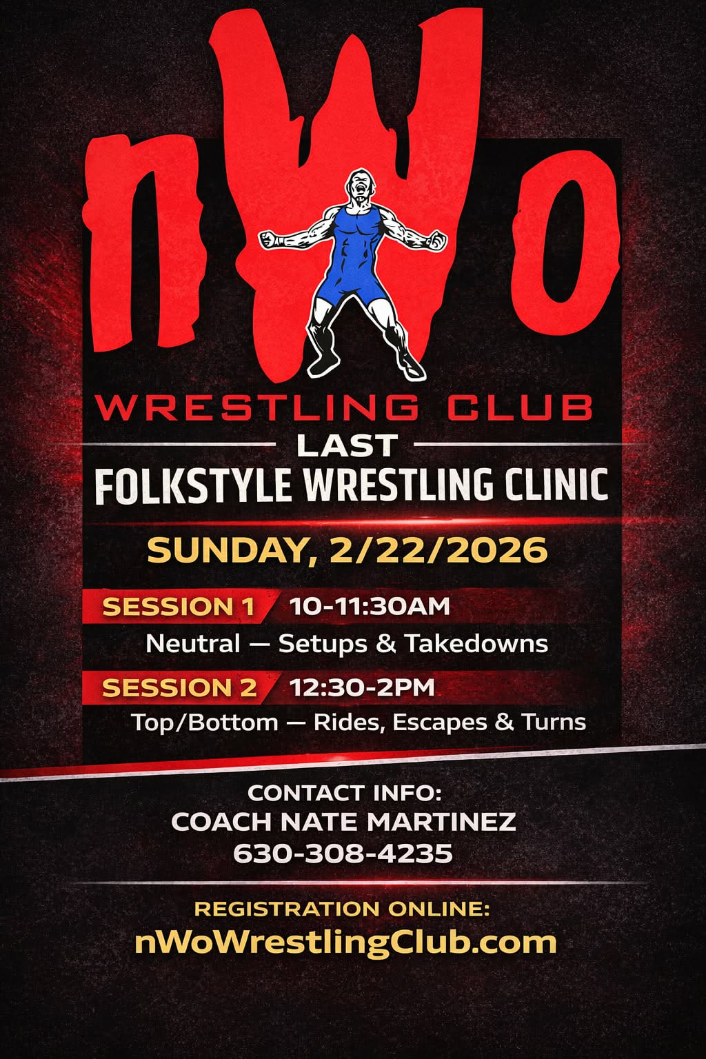 Refine your technique and sharpen your competitive edge at the nWo Wrestling Club’s final Folkstyle Clinic of the season. Led by Coach Nate Martinez, this high-intensity, two-session intensive is designed for wrestlers who want to master the fundamental positions that win matches: Neutral, Top, and Bottom.
